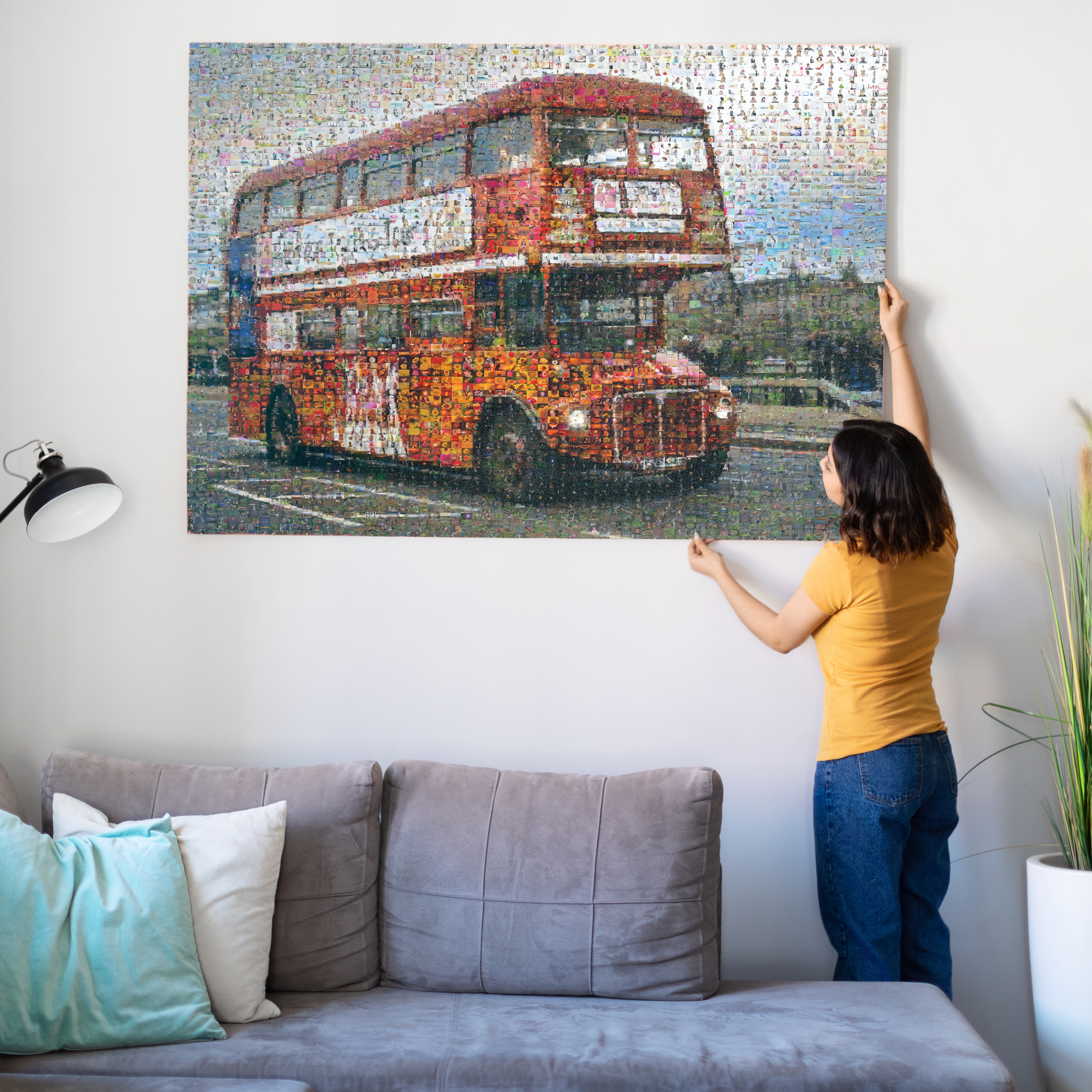 Create your own masterpiece with our personalized photo mosaic featuring a London double-decker bus made from your treasured photos. This product is perfect for travel enthusiasts, families, or friends who want to capture their travel memories stylishly. Whether as a decorative highlight for your home or a unique gift, customize the photos and main motif to reflect your story.