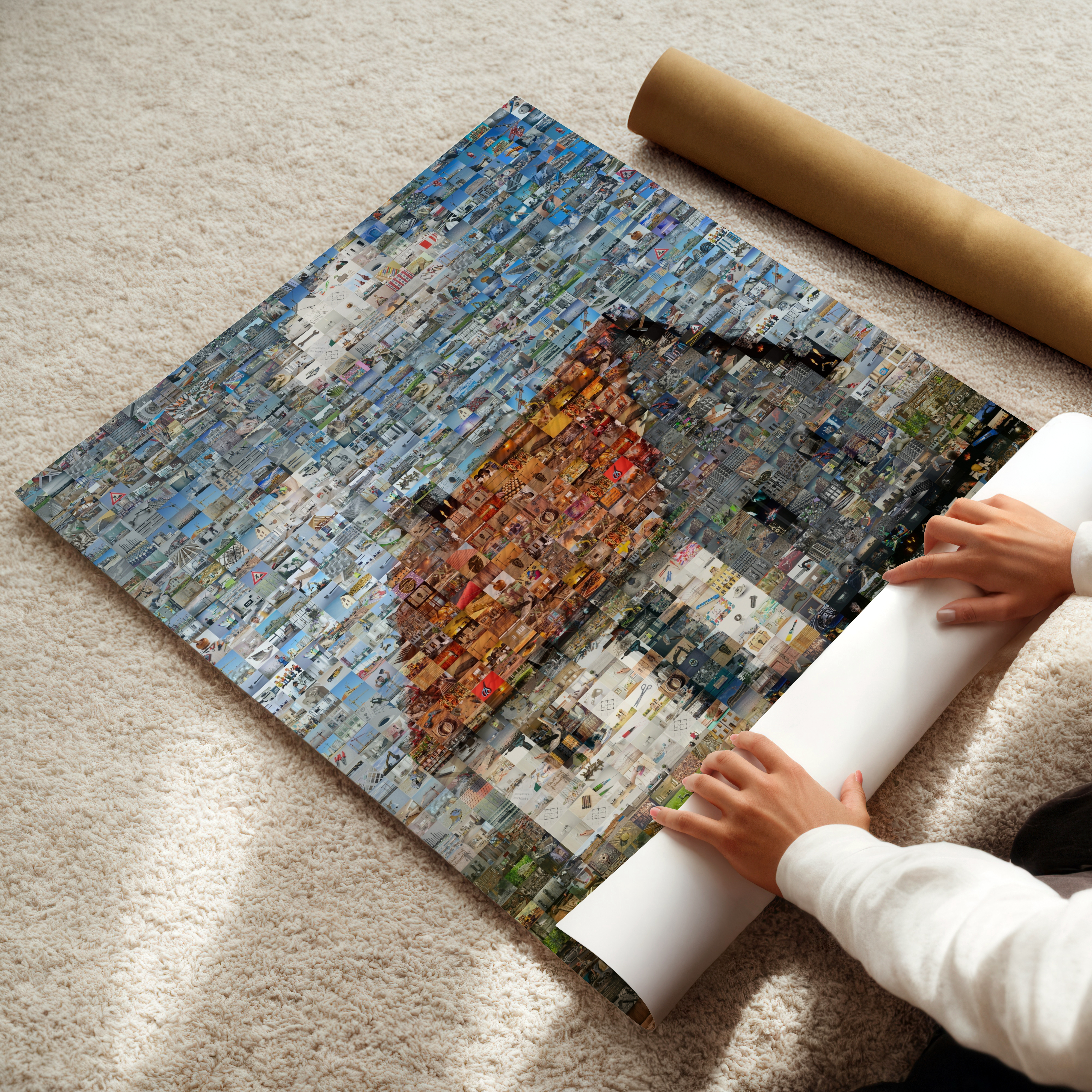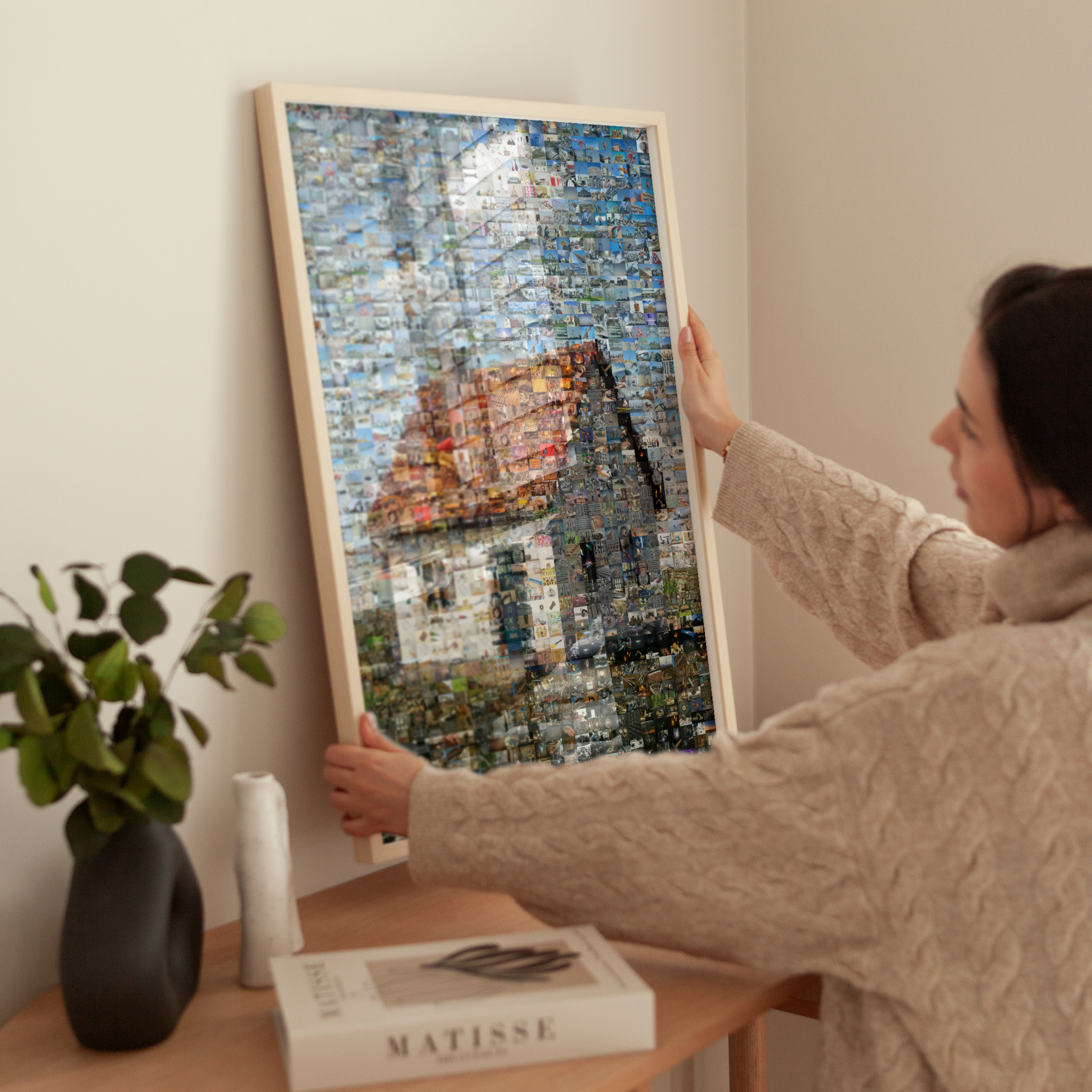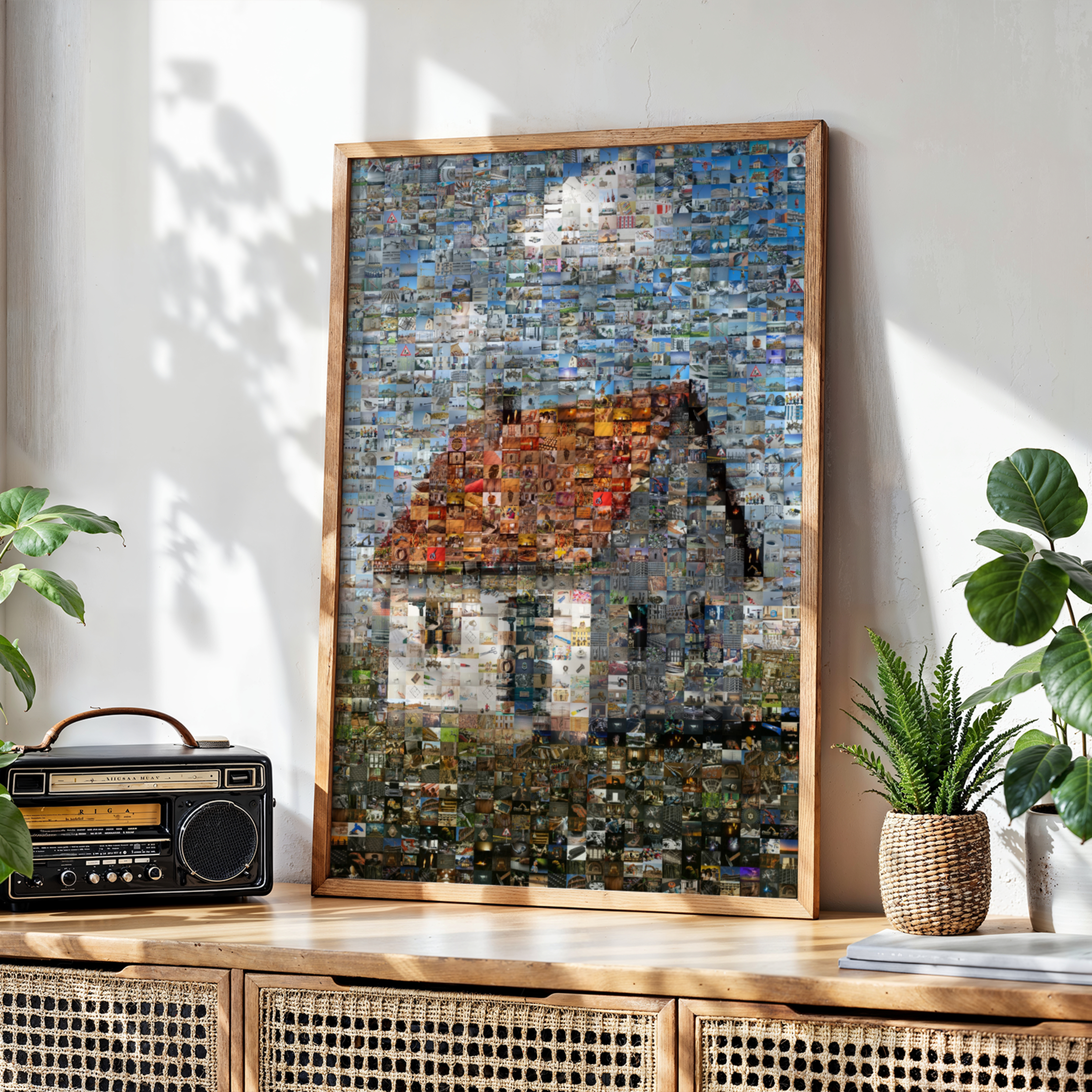 Create yours now. Your project as a mosaic: a house motif built from all the site photos you captured during the build, from ground-breaking to move-in day. Progress shots, milestones, and proud moments merge into one artwork that documents the journey and keeps the story of your home alive with quiet pride.