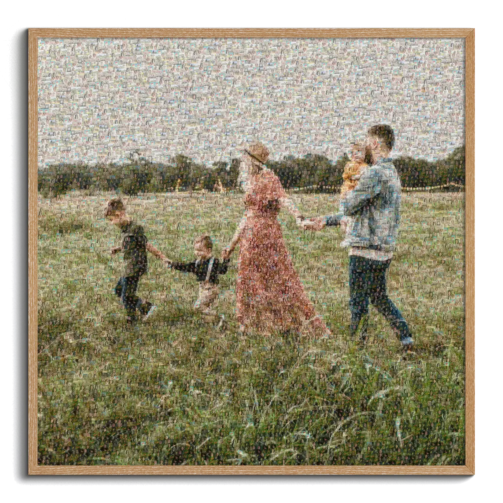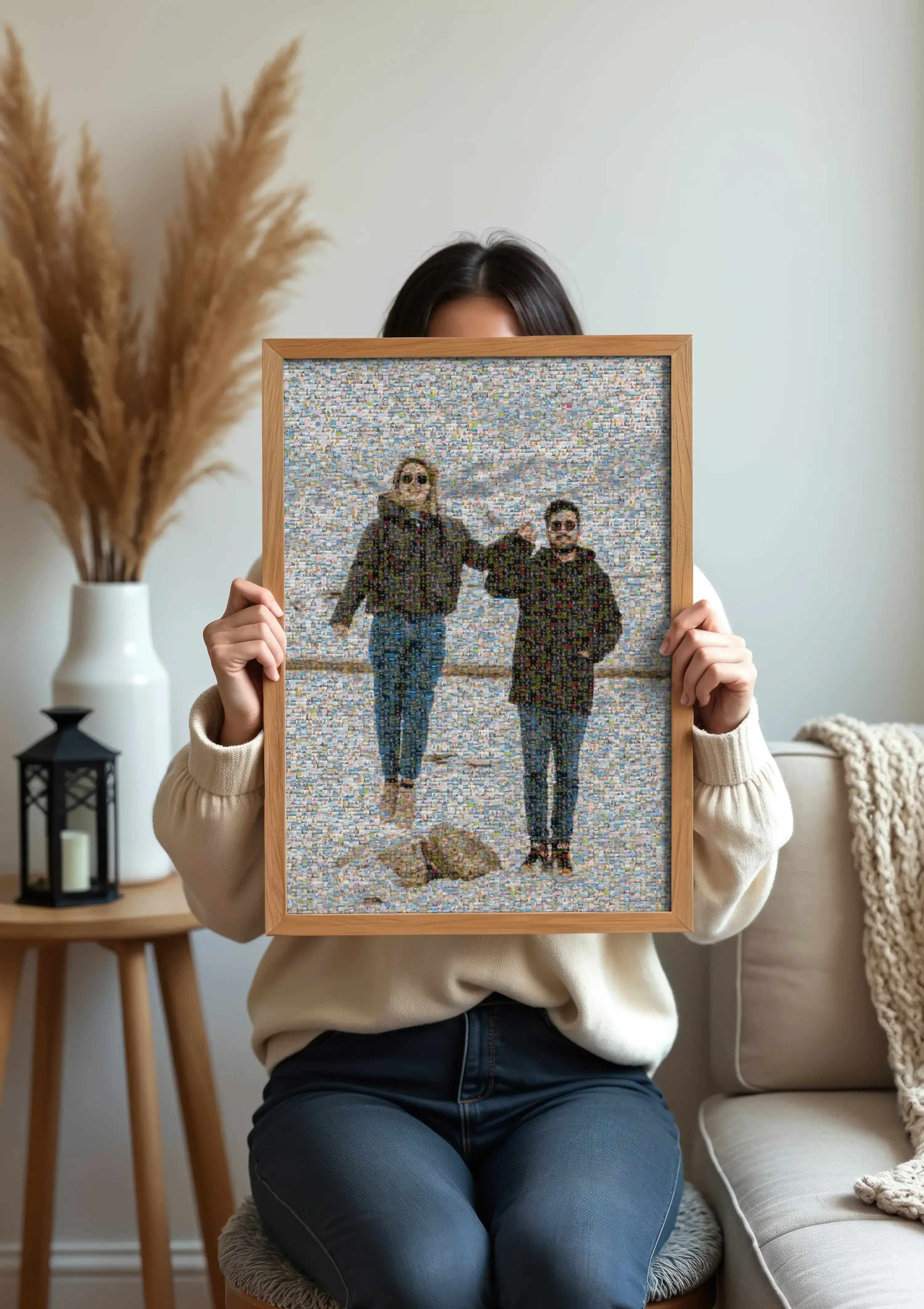It’s simple: upload the main picture you want to see from a distance, choose your print size so the tile size is optimized automatically, then upload the photos from your year. Enter an email address and we’ll generate several mosaic variants in the background and send you the preview when it’s ready, free and non-binding.